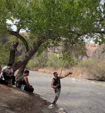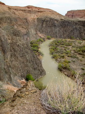 Дорога привела нас, как мы думали, к основному спуску, и мы без задних мыслей начали спуск. Но через некоторое время поняли, что спуск хоть и должен быть поганым, но не настолько, и это совсем не тот спуск. Был он таким же как и подъем по которому мы приехали. Но разворачиваться уже было поздно, так как спустились мы далеко и в некоторых местах могли бы просто не подняться обратно. Но все обошлось - дорога хоть и ужасная, но вывела в итоге нас на равнину, и мы поехали вдоль гор обратно. Вскоре наш бодрый заезд прервала речка. Это была та речка, в которой в прошлом году мы чуть не остались. Почему же никто не построил мост? Эх. Но если с того берега на этот можно было хотя бы попробовать переехать, то отсюда противоположный берег казался просто обрывом. Поэтому надо было искать другую переправу. И мы её нашли гораздо ниже по течению, но дорог там не было совсем никаких, поэтому около часа мы ехали просто по заросшей степи – по сухой пыльной тоскливой степи. Когда же мы вернулись обратно на дорогу, которую так вероломно нам оборвала река, времени было уже совсем много и гулять было некогда - мы рванули домой. А дорога все не кончалась и не кончалась и нам пару раз приходилось делать перерывы, чтобы размяться, передохнуть и просто покидать бумеранг. На последок, уже почти у Отара на поле встретилась незнакомая птичка. Подъехав поближе я узнал в ней краснокнижную дрофу! Но так как дрофу я видел только на картинках, я конечно же ошибся - это был стрепет. Хотя, он тоже краснокнижный. Позировать он разумеется отказался, а бегать за ним уже было некогда, к тому же уже было сумеречно и начинался дождь.
