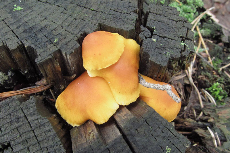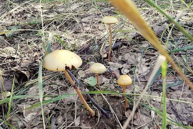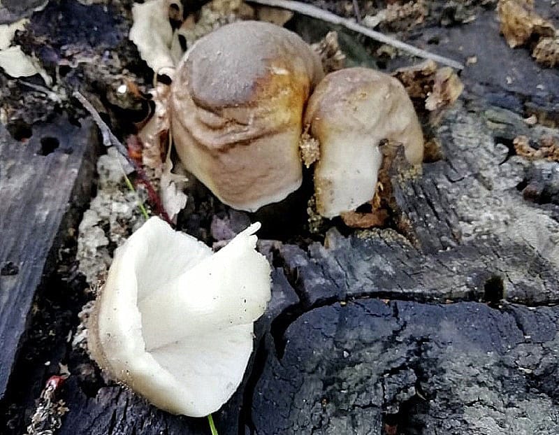 Всем добрый вечер! Подскажите что это за гриб? Растет на пнях гнилой березы, запах сьедобного гриба, как и всех обычный. Ножка плотная, мясистая, немного уже поедает червь. И второй грибок чуть ниже, произрастает на и возле конского навоза.