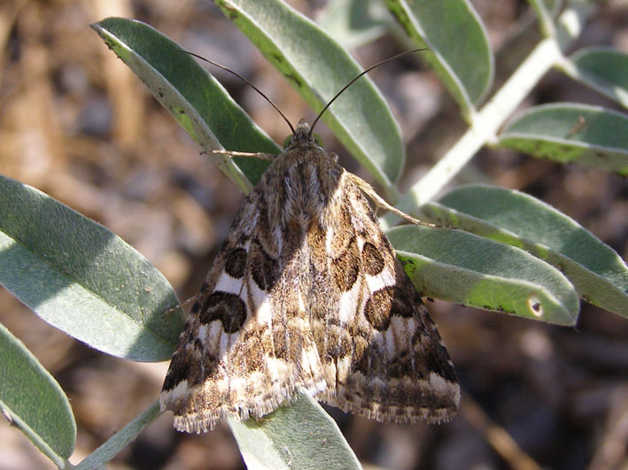 Совка полынная ![]() Передние крылья 15–19 мм, сероватые, с типичными для совок темными пятнами (почковидным, округлым и клиновидным); в постдискальной области заметны светлые жилки. Вид очень широко распространен в западной половине Евразии, Северной Америке, на севере Африки. Мигрант, способный заселять любые открытые местообитания. На Южном Урале лет наблюдается с конца мая до начала сентября, в двух генерациях, вторая из которых более многочисленна. Одна из самых обычных бабочек южной степи. В Оренбургской области в августе на свет одной лампы могут прилетать несколько тысяч особей за ночь. В сумерках они во множестве питаются на различных цветущих растениях, часто концентрируясь у посадок подсолнечника, люцерны и др. Гусеницы зеленые с беловатыми продольными полосами. Живут па полынях и мари, других травянистых степных растениях. Изменил(а) focusfuturegroup, 06-12-2013 22:03. Причина: +