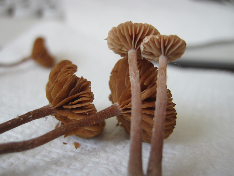 Нет, у этой пластинки даже в молодости совсем темные, она мельче, и ноги у нее не пропорционально длинные. Шляпка у той была изящнее, отношение мякоти и пластинок к диаметру совсем другое.