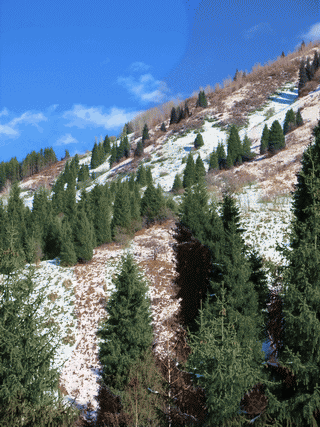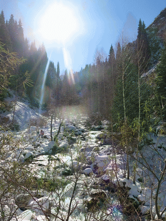Заилийский Алатау. Много лет назад, по ущелью, где протекает Весновка, промчался сель и оставил много валунов. Потом пойма заросла лиственными деревьями и на 29 ноября 2015 года приняла настоящий вид. Из-за оттепели проснулись насекомые. Очень много божьих коровок, практически на каждом валуне и дереве. Долгоносики и кажется муравьедки ползали по мху. Под листвой кучками яйца улиток и слизней.