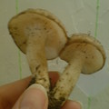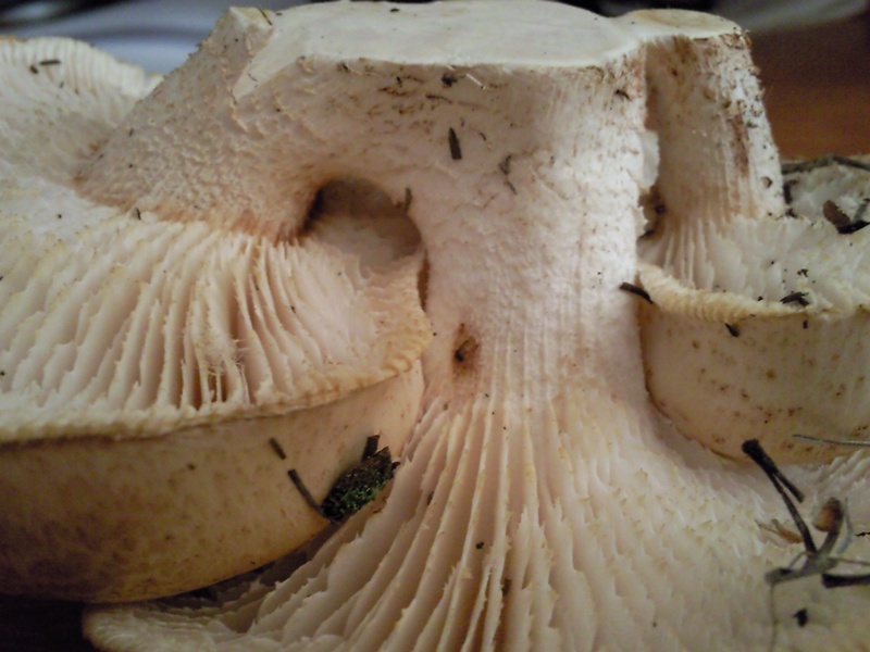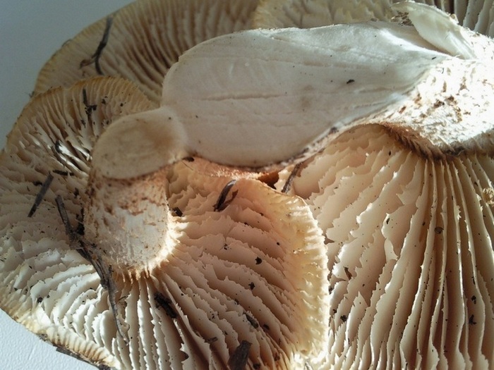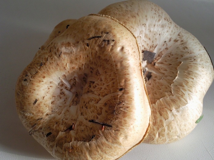 Olga Bondareva написал: И несколько неизвестных. Похожи на майский, но ножка у них серая и запах ярко выраженный немножко резковатый. Судя по характерному бугорку на шляпке и частым пластинкам, это меланолевка. Из белых есть Меланолеука альпийская (Melanoleuca subalpina), но у нее ножка потоньше и былеая. Поэтому моё предположение, что это меланолевка полосатоножковая (Melanoleuca grammopodia) - ножка серая с продольными полосами, цвет шляпки очень вариабельный, и может быть до грязно белого, вот например Хотя, массивность ножки все же смущает.. Natusia написал: Или экран так цвет передает или на третьей фотографии у ножки перевернутого гриба пластинки немного фиолетового оттенка?! Да наврядли, если развернуть фото, то оттенка этого нет. |