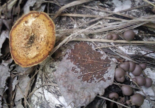 А вот отдельная фотография с маленькими ... Из-за отсутствия опыта и маленьких размеров определить не получилось. Но очень хоцца, чтоб это были будущие опята(шанс есть?). Три следующие тоже для меня загадка - если под описание подходит шляпка, то не подходят ни гименофор, ни ножка (за качество фото ножек прошу прощенья, но они даже фотографироваться нормально не хотели). А в целом это поездка опять была похожа на прогулку. Из известных съедобных был найден один подберезовик и несколько дождевиков( за 4 часа блуждания по разным лесам).