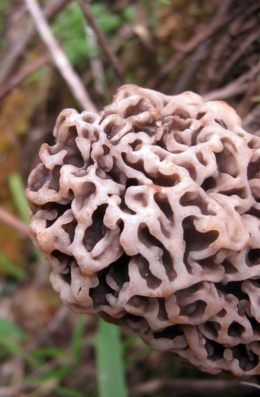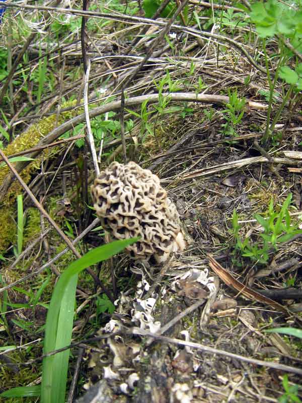 Показывал он нам какую-то гору, на которой теплее и они уже начались, но мы, сделав крюк км 80, так ее и не нашли. Сморчок конический мне попался, молодой, в единственном экземпляре. И попался еще один сморчок, на пне, по окраске очень похожий на степной. |