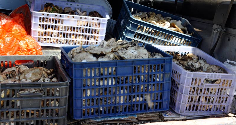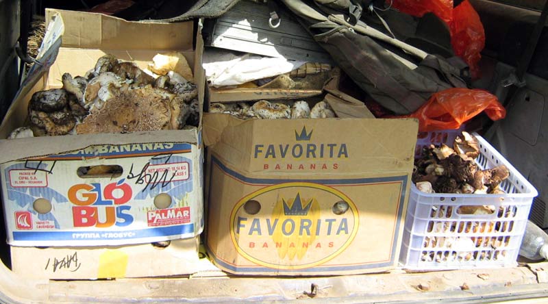 Судя по карте это хребет Кетмень, горы Кулуктау, недалеко от пос. Жалаулы. Перед самыми ельниками оказался шлагбау, но лесник спокойно пропустил нас, не говоря ни окакой плате, сказал, что грибы есть. Подъехали прямо к ельнику, GPS показал высоту 2000. То, что грибы есть, было сразу видно. Очень много срезаных. Самое интересное началось в 8 утра. Сначала с небольшими интервалами проскакало с десяток джигитов, причем на некоторых лошадях сидело по двое. Двое приехали на ишаках. Более десятка пришли пешком. Надо было видеть, как они собирают: становятся в метре друг от друга и идут по склону. Собрать что-то после маловероятно. Но их можно понять - для местного населения почти единственный источник дохода. Нам предлогали грузди свежего посола по 1000 тенге. Для первых - это недорого, в Алма-Ате сейчас оптовая цена 1400. Пособирав немного остатки (получилось 2 сетки), мы решили ехать дальше, искать места вдали от населенных пунктов |