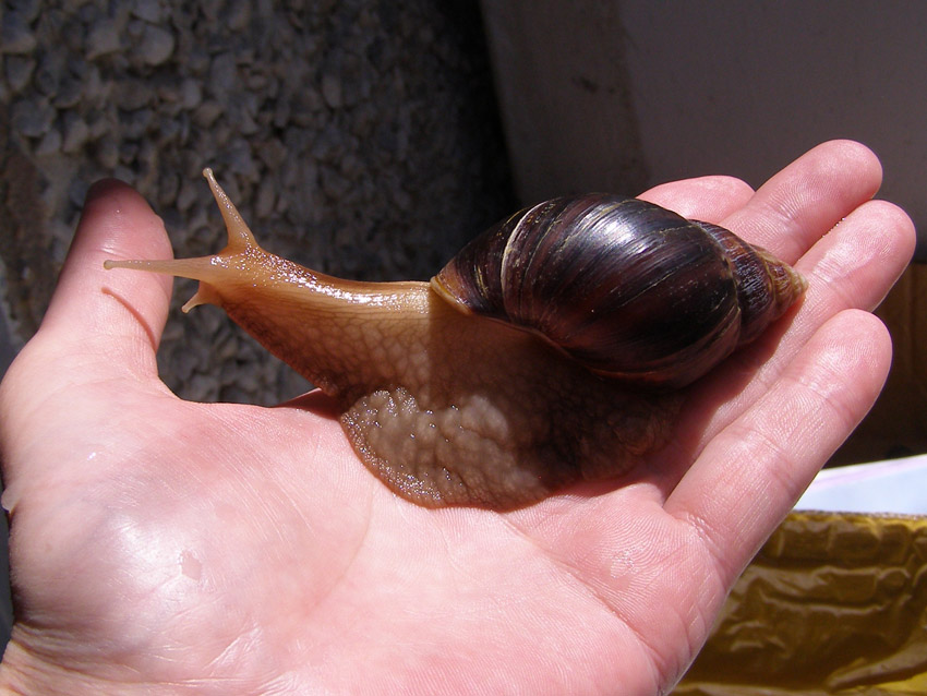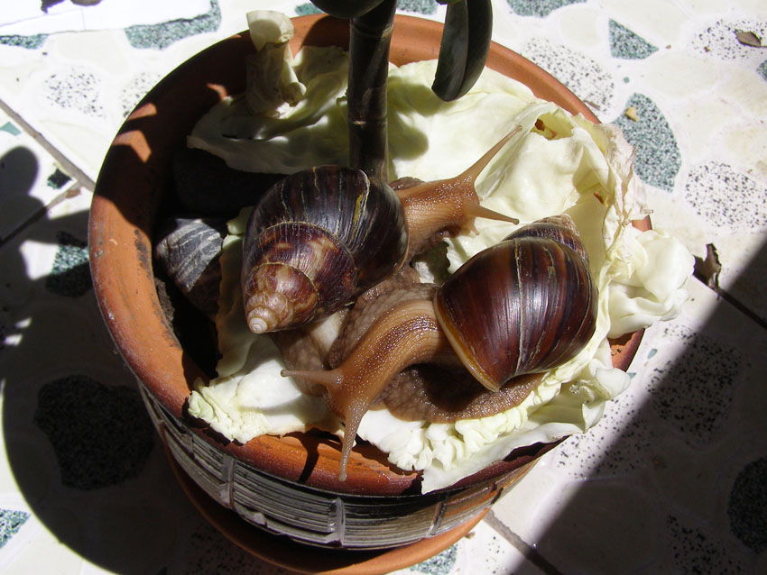 Люди держат дома разных животных. У меня живут две улитки, Ахатины. Оля и Яло на прогулке.