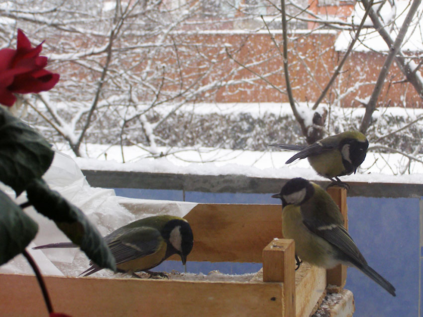 Зимой, как обычно, подкармливаем птиц на балконе. Завсегдатаи синицы. Прилетают также воробьи, горлицы, сороки, вороны. Дома выгуливаю Ахатин (африканские улитки) и развожу дрозофил.