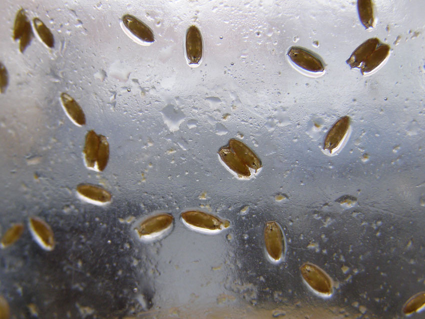 Нет, это куколки мушек дрозофил. Из-за большого количества комнатных растений, в квартире постоянно обитают эти интересные мушки. Поймал несколько крупных и посадил в банку с яблочным пюре. Это их будущее потомство. Дрозофилы знамениты как объект генетических исследований из-за высокого темпа размножения и простоты содержания.