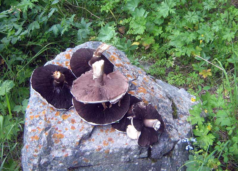 На камне попались собранные накануне кем-то шампиньоны, собрать собрали, а нести, видно, было лень. Или решили, что это поганки.