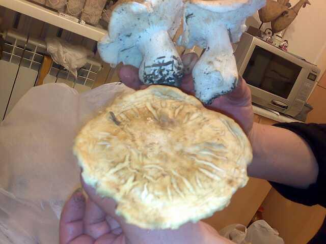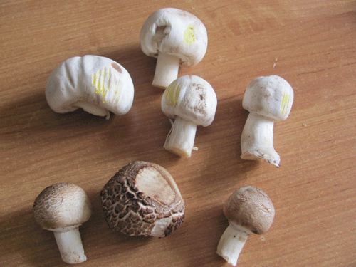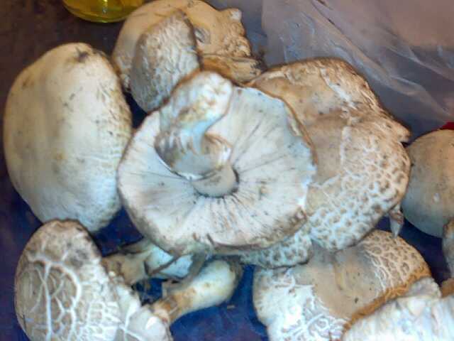 1 и 5 фото это один гриб. Не пойму характер чешуек, они родные или просто гриб подсох и потрескался. Соответсвенно вариант, либо это Белошампиньон румянящийся (Leucoagaricus leucothites), либо кто-то из зонтиков Macrolepiota. Точнее по такому фото, без дополнительной информации (местность, вкус, запах, изменение цвета мякоти на изломе и пр.) сказать трудно. 2. Интересно, такой не попадался. Похоже что-то из лейкопаксиллусов, например что-то вроде Leucopaxillus albissimus, но тут опять же наверняка просто так не скажешь, гриб не особо характерный. 3. Снизу беленький - вальвариелла красивая, черный сухой - монтанея песчаная, большой - шампиньон полевой. 4. Цвет не очень понятен, похоже шляпки желтые, тогда это строфария корончатая, а если белые - шампиньоны. |