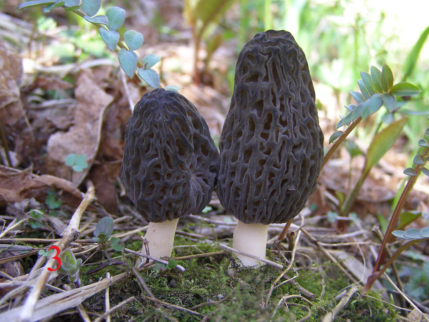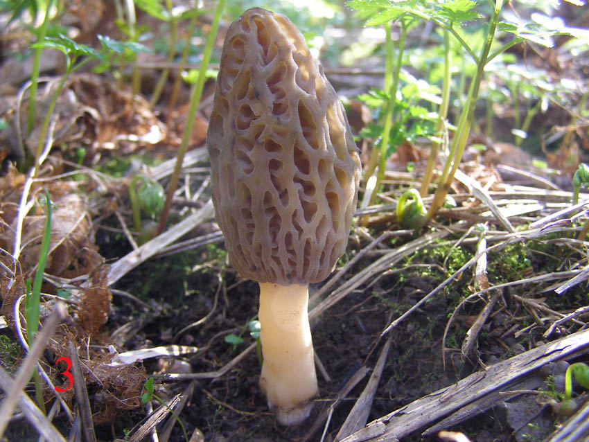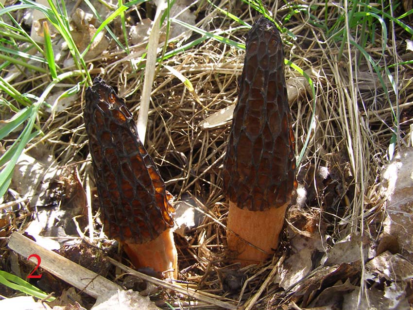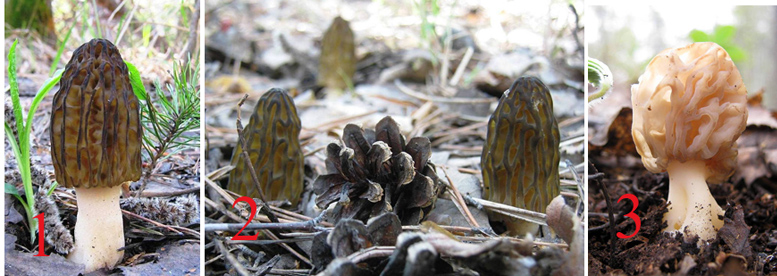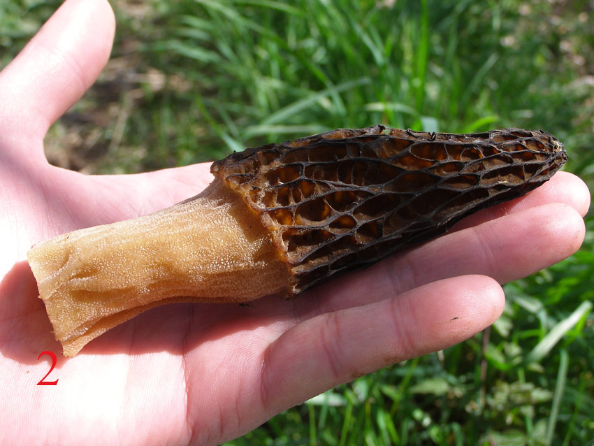 Под номером 2 это уже возрастной сморчёк обыкновенный (M. vulgaris). Вчера мне попалось несколько экземпляров.