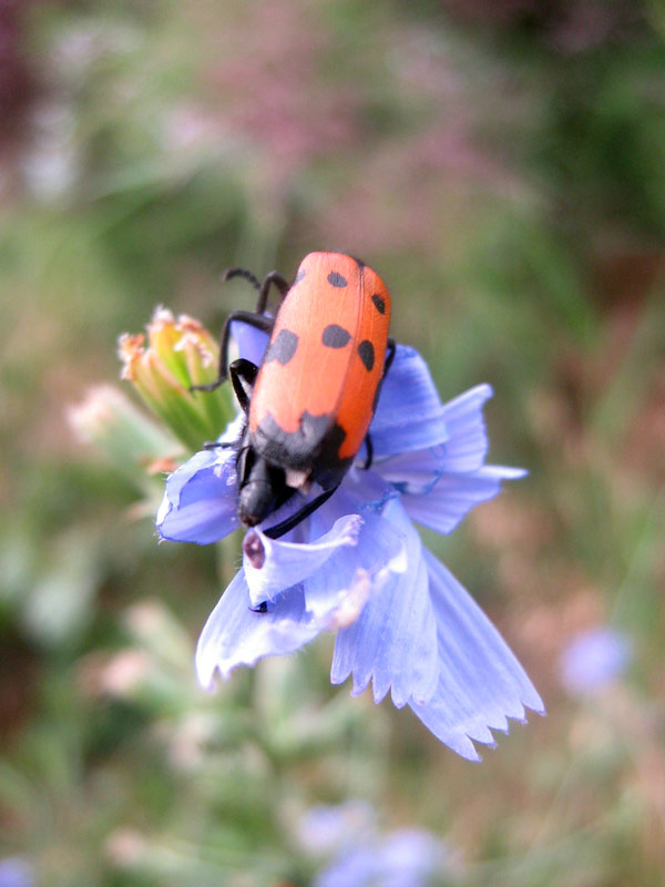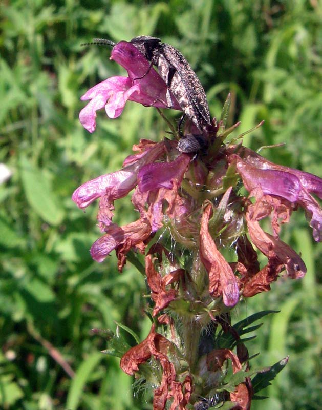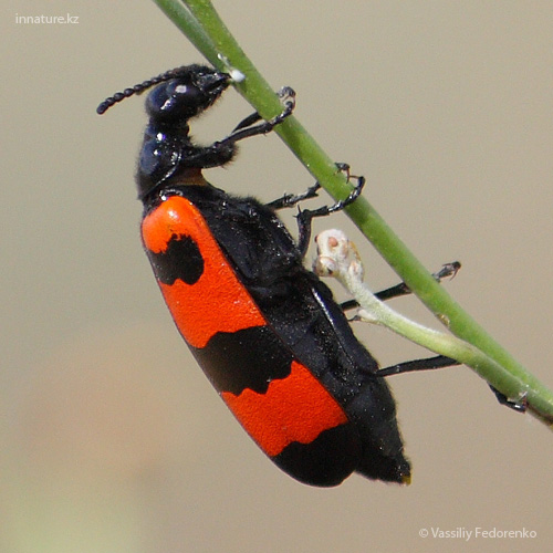 Так вот, это Нарывник изменчивый Mylabris variabilis. Краткое описание: Нарывники распространены в Средней Азии и Казахстане, на Кавказе. Надкрылья красные или желтые с черными перевязями, тело обычно черное с металлическим отливом, густо волосистое. Личинки паразитируют на саранчовых. Жуки питаются цветами, реже листьями. Известно свыше 70 видов, в том числе нарывник изменчивый Mylabris variabilis С одного казахстанского сайт: А нынче мне еще довелось испытать на себе, что будет, если раздавить жука-нарывника. В наших краях он бывает трех видов: майка фиолетовая, шпанская мушка, нарывник изменчивый. Последний и оказался на моем предплечье. Я его раздавил. В этом месте вскоре возникла боль, позже появилась припухлость, а потом образовался нарыв размером с монетку. Причиной тому яд, который жук-нарывник использует при защите и нападении. Кстати, этих жуков в последнее время стало больше. Тому способствует погода, а также увеличение численности ос и пчел, в гнездах которых развиваются личинки нарывников. Кроме названных ядовитых насекомых обитают в нашей области и другие, не менее опасные организмы: скорпионы, скалапендры, пауки – тарантул и каракурт. То-то их никто не жрёт! |